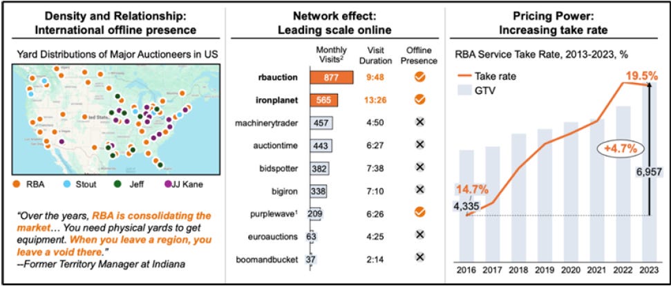 The core thesis is that RB Global is a best-in-class auction platform for heavy equipment and auto salvage that is being mispriced due to market skepticism around its large 2023 acquisition of IAA. RBA’s legacy business—auctions of used commercial equipment—has long been a stable, asset-light model benefiting from counter-cyclical dynamics: when new equipment is expensive or scarce, auctions become more popular. RBA charges take rates on both buyer and seller sides, with consistent gross transaction volume (GTV) growth through economic cycles.