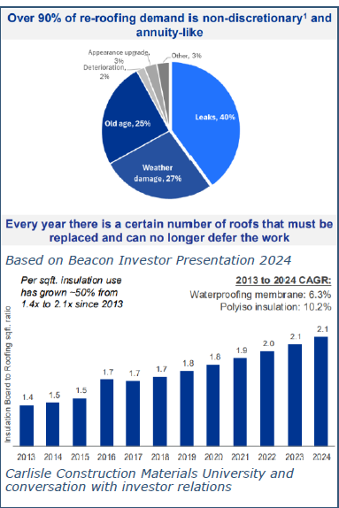 Carlisle now commands ~33% market share in commercial roofing, a sector with highly attractive economics: long replacement cycles, high regulatory requirements (especially around insulation and fire protection), and relatively low sensitivity to discretionary spending. The business is also exposed to multiple secular tailwinds. The average age of U.S. commercial buildings exceeds 50 years, meaning reroofing demand is durable and predictable. Stricter energy efficiency codes are driving demand for better-insulated roofs, especially in regions with extreme weather.