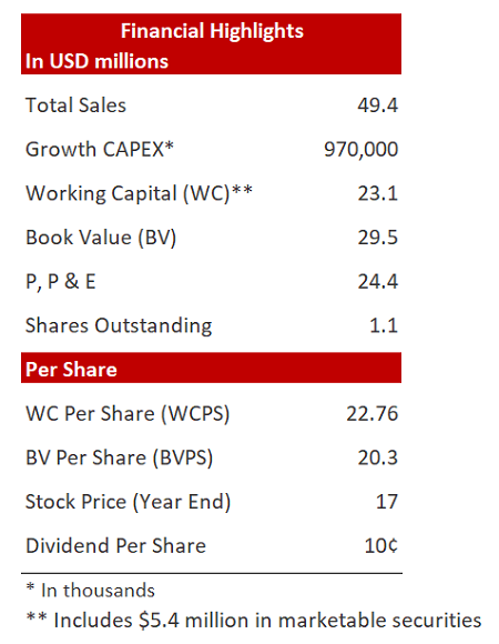 Despite challenging markets, the company achieved steady sales of $49.4 million and strengthened its financial position with $23.1 million in working capital and a $29.5 million book value.