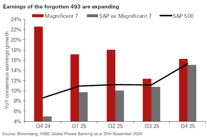 Equity Market Dynamics: U.S. equities are expected to continue their bull run, with broadening market leadership beyond the "Magnificent 7." Earnings growth is projected to reach 15% in 2025, driven by improving margins and capital investments. Sectors like industrials, energy, and consumer discretionary show strong recovery potential.