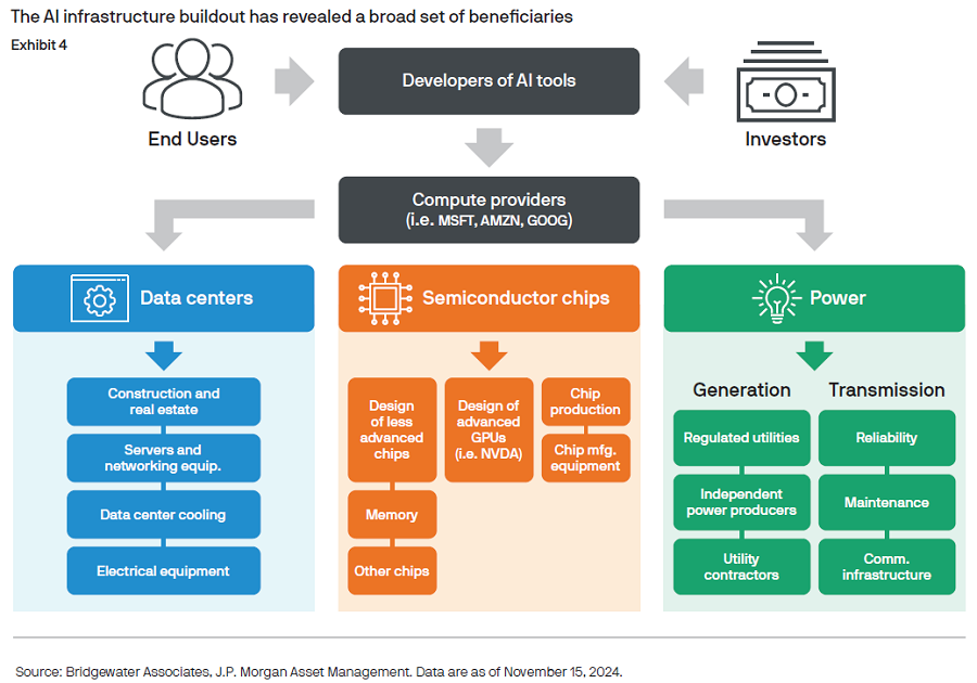 The Role of AI in Investments: AI continues to be a transformative force but faces challenges such as energy demands, implementation complexities, and societal trust issues. Selective investment in industries where AI can drive productivity is key, as broad-based gains are limited in the near term.